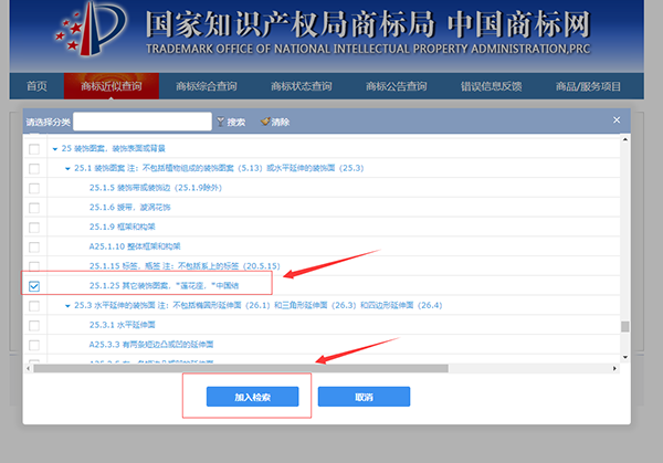 7、点击“放大镜”图标后,会出现具体图形商标查询页面。例如:选中25.1.25 其它装饰图案,*莲花座,*中国结。选择好后,点击“加入检索”;