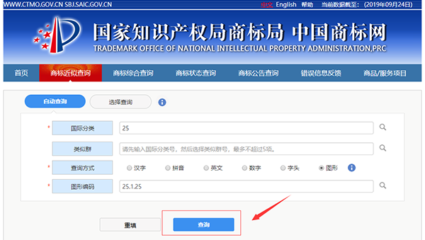 4、 进入查询页,选择国际分类,输入要查询的商标的国际分类。例如:输入25(二十五类 服装,鞋,帽);