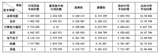 专利数据库将专利技术领域分为6大类:化学、计算机与通信、医药、电气电子、机械和其他领域" alt="美国专利数据库将专利技术领域分为6大类:化学、计算机与通信、医药、电气电子、机械和其他领域" width="554" height="190"/>注:其中延展性是指某专利被其他领域的专利引用的次数,该值较高代表着该专利包含着比较通用的技术知识。源散性是指某专利引用其他领域专利次数,该值高代表该专利是更多领域的融合。引用的平均时滞指专利引用的时间与专利被授权时间之间的时间,反应了引用的速度。