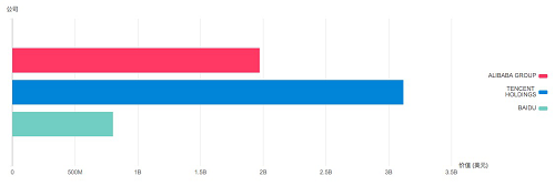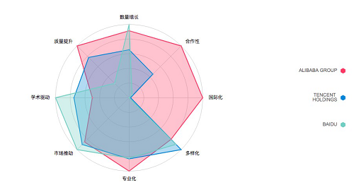 如上图中,提及 BAT 中任何一家,都有必要将其他几家互联网巨头拿出来做比较。三者对比,专利数量处于劣势的百度侧重于专利数量的增长,以及专利的市场有助于作用;阿里巴巴则更关注专利质量的提升以及专利的专业化,这也一定程度上解释了阿里巴巴专利数量少但专利估值高的原因;拥有最多专利的腾讯则更关注专利的国际化和多样化。