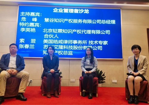 随后,北京钲霖知识产权代理有限公司合伙人李英艳、美国皓咸律师事务所技术专家索翌以及苏州艾隆科技股份有限公司知识产权总监张春兰参与了慧谷知识产权服务有限公司总经理危峰主持的企业管理者沙龙,几位讲师与学员们分享企业现在召开知识产权保护采取的策略、遇到的问题及解决方法,并针对台下学员提出的各自企业现在面临的知识产权以及企业知识产权管理和开展问题给予解答,与台下学员展开热烈的研讨。