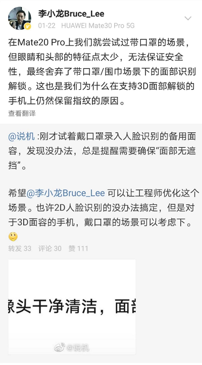 有用户开始怀念起曾经的指纹识别,当然也有厂商提前考虑到了这一点,同时保留了面部识别和指纹识别功能。华为P系列产品经理@李小龙Bruce_Lee前不久就在微博上回应了网友关于手机面部识别的问题。