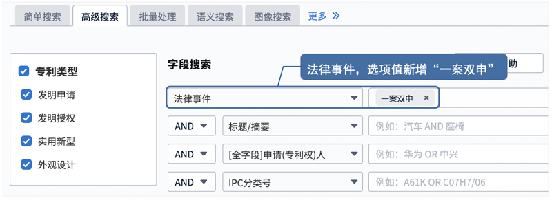 系统中的法律事件字段,新增“一案双申”事件类型,支持对该状态进行检索、过滤、展示,辅助您快速定位行业或竞争对手重点专利,洞察竞争对手专利布局策略。