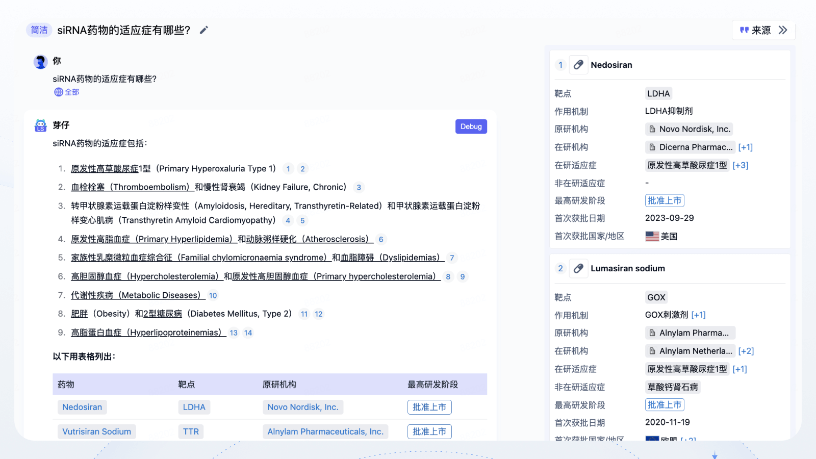 与AI助手“芽仔-生物医药”对话,为您解答医药竞争格局、临床试验与循证医学、序列/化合物专利、政策与准入等问题