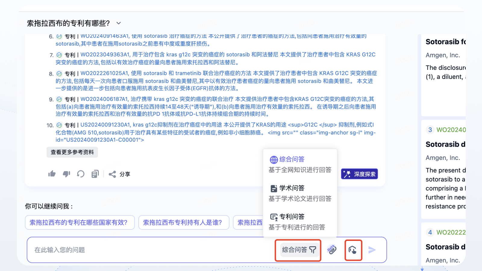 支持基于全网知识、学术论文、专利文献等模式进行回答